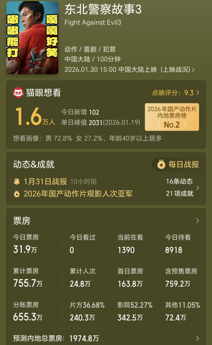 至于原本很被看好的《东北警察故事3》,更是可以用惨败来形容。
